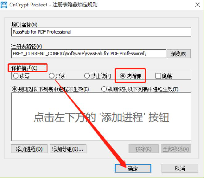 4、此时,CnCrypt Protect会自动跳转至该注册表信息对应的隐藏锁定规则设置窗口。我们根据自己实际需要选择保护模式,再点击窗口右下方的“确定”按钮,这里选择的是“防增删”模式,别人就不能对我们选择的注册表信息进行增加或者删除操作了。