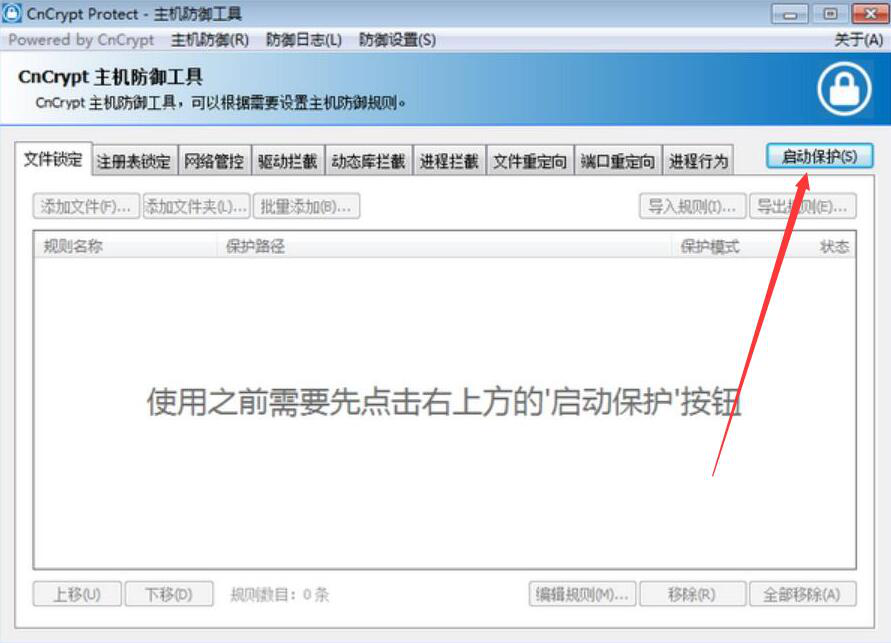 1、首先,我们打开CnCrypt Protect,切换至“文件锁定”选项卡,并在其界面的右上方,点击“启动保护”按钮,从而开启对电脑文件的保护。