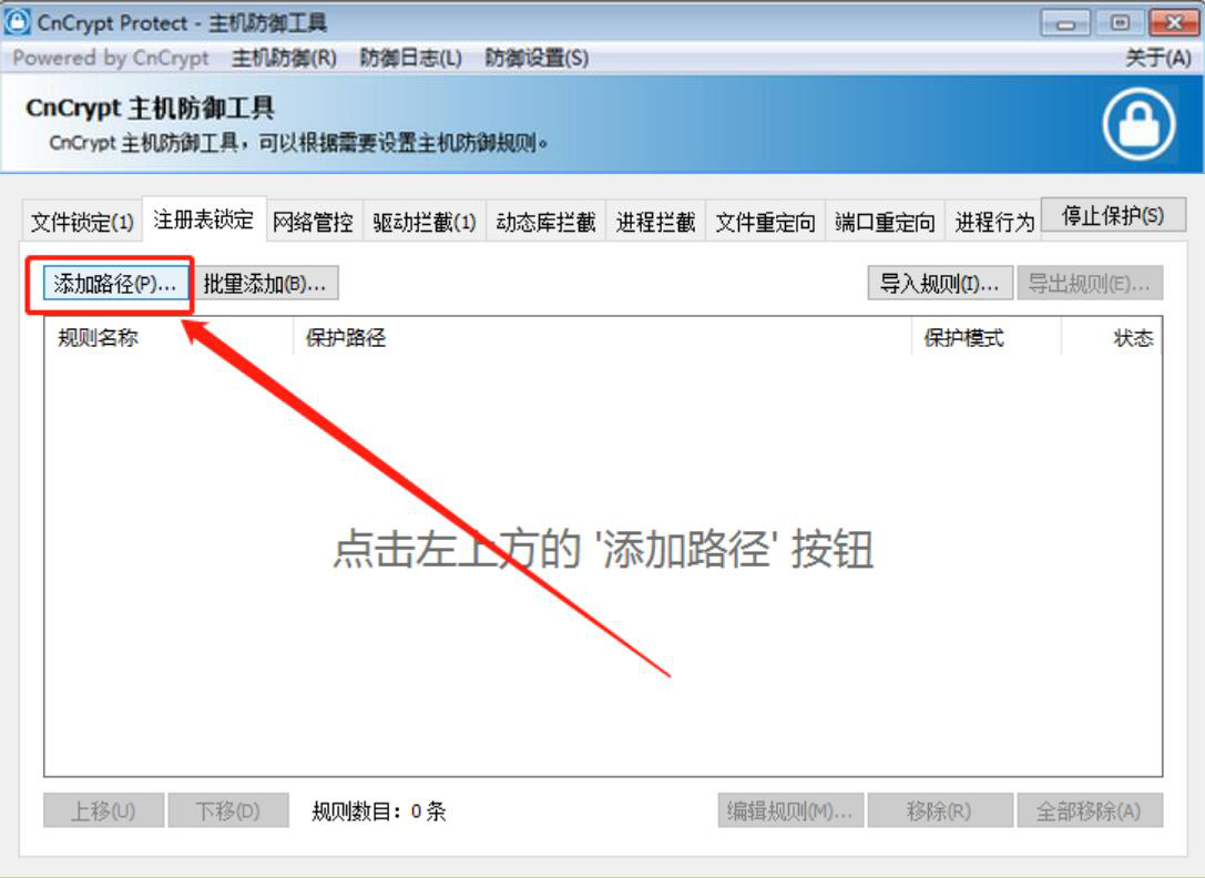 2、然后,切换至CnCrypt Protect的“注册表锁定”界面,点击左上方的“添加路径”按钮,从而进入注册表浏览器。