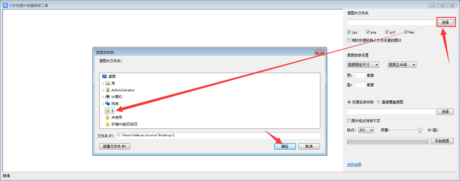 2、弹出裁剪工具窗口,点击右侧源图片文件夹一栏中的【选择】,浏览需要裁剪图片所在的文件夹,然后点击【确定】。