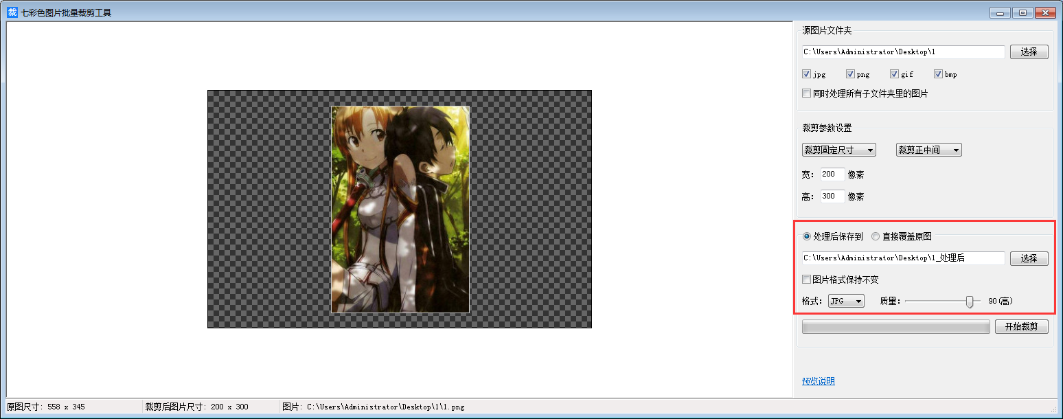 5、接下来勾选“处理后保存到”,然后点击下方【选择】浏览裁剪图片保存位置,并设置图片格式及质量。