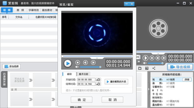 3、弹出预览/截取窗口,这里可以按需要直接截取素材中的某个片段,设置之后点击【确定】。