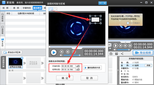 5、这时就会弹出选取时间段与区域窗口,首先选择去水印的图形,这里有矩形和椭圆两种图形可控选择,选择矩形即直接点击矩形图标,这时在预览区域就会出现图形,拖拉该图形可进行移动和缩放;接着设置局部去水印的时间段即去水印操作开始时间和结束时间,最后点击【确定】即可。