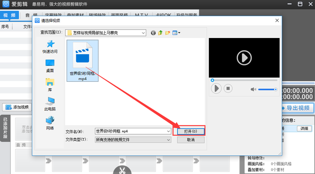 2、弹出浏览窗口,浏览电脑选择需要打马赛克的视频素材,点击窗口下方【打开】。