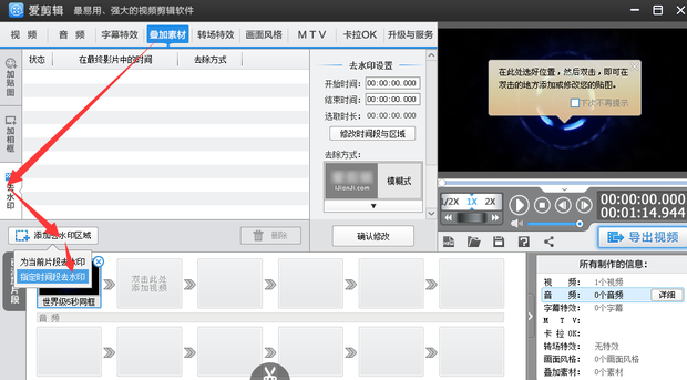 4、回到主界面,选择上方菜单选项中的【叠加素材】,然后选择左侧【去水印】,点击下方【添加去水印区域】;关于去水印区域这里可以选择当前片段也可以选择指定时间段,为了方便说明,我们这里选择【指定时间段去水印】,