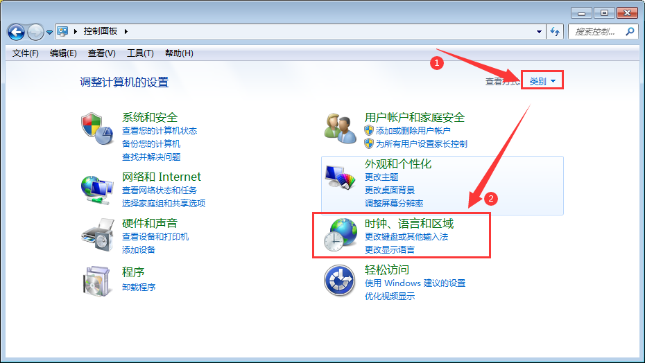 2、弹出控制面板窗口,查看方式选择【类别】,然后在其下列表找到并点击【时钟、语言和区域】。