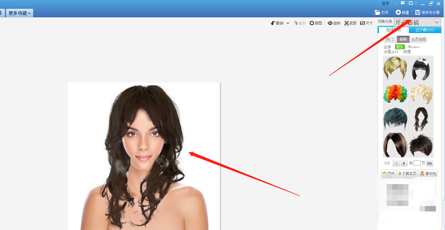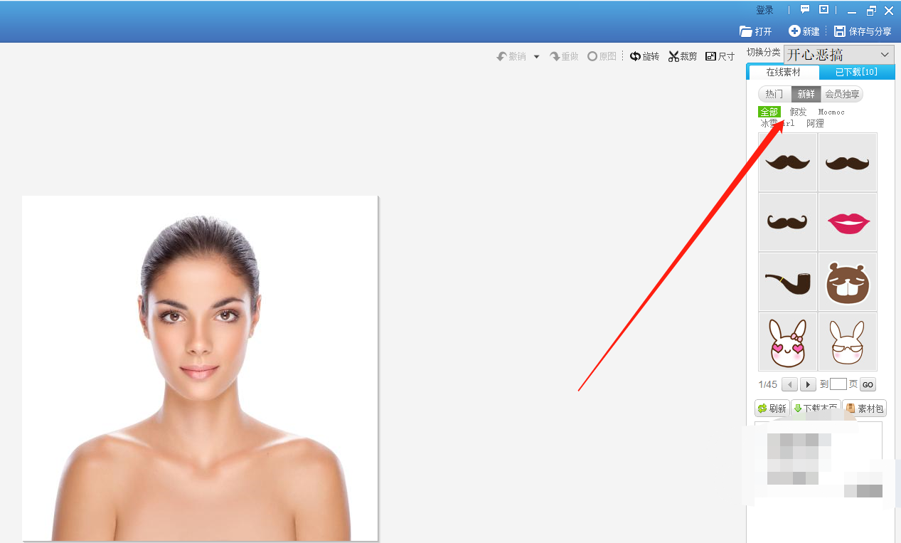 进入图片编辑窗口,如图,点击【静态饰品】——【开心恶搞】,然后在右侧栏目选择【假发】,