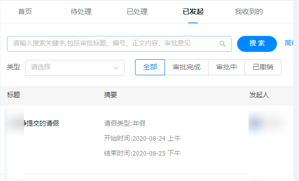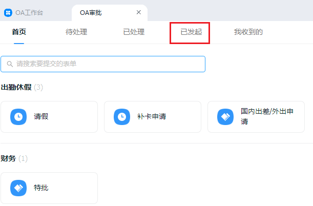 进入OA审批管理窗口,点击【已发起】,通过搜索功能找到需要打印的审批表单,