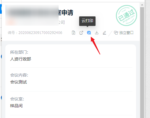点击打开表单,查看详请,在一组功能图标中找到【云打印】,