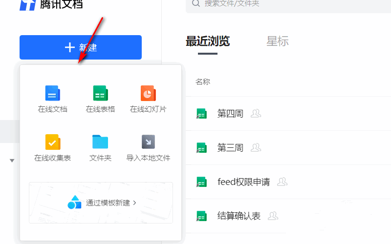 打开腾讯文档,如图,点击【新建】,展开菜单,选择【在线文档】,