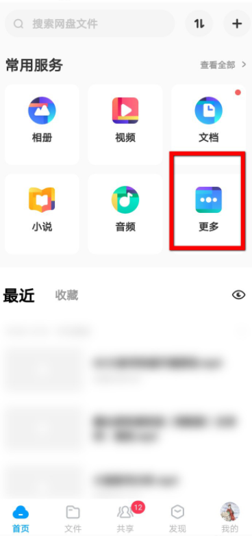 在手机中打开百度网盘,进入界面,点击【常用服务】——【更多】选项,