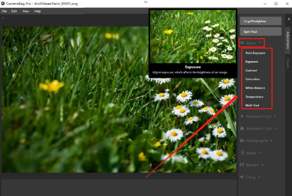 3、回到CameraBag Photo操作界面,在右侧功能栏中点击“Basics”选项。并从它弹出的特效列表中,将鼠标移动到不同的特效上,便可以在左侧的图片预览窗口中同步看到特效的动态效果。