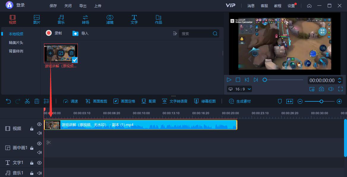 4、视频成功导入,鼠标单击该视频,并点击“+”按钮,该视频便会自动加载至视频编辑轨道。