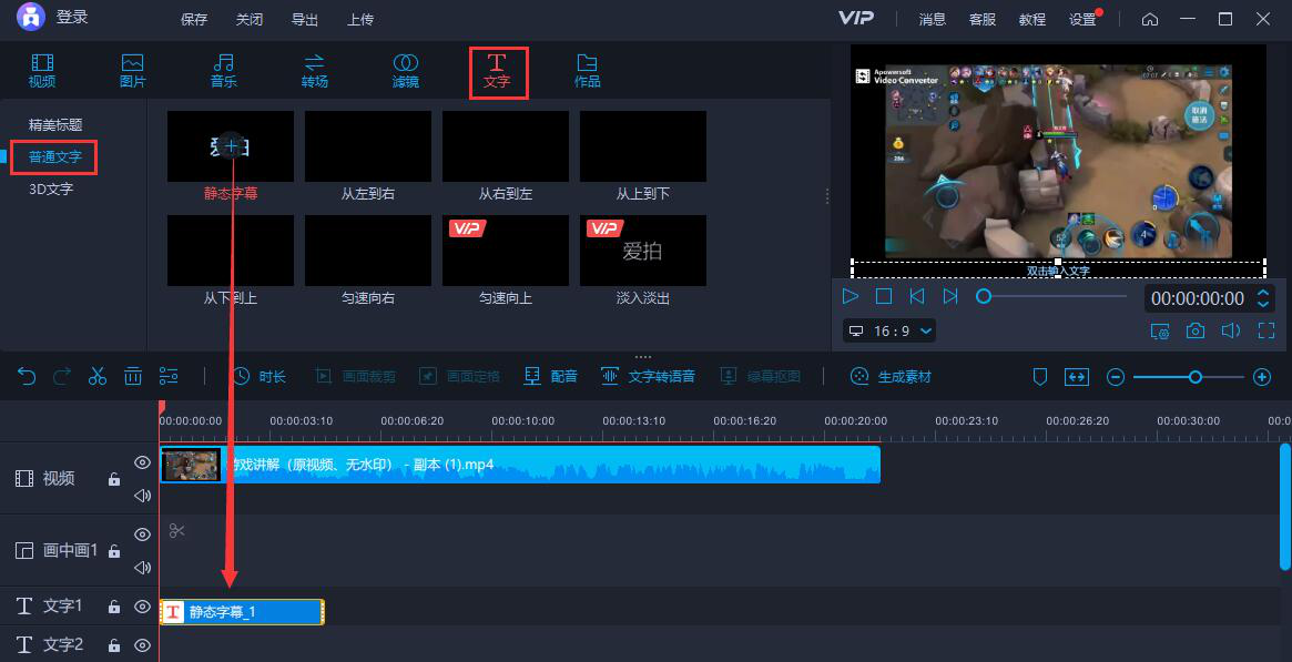 5、接下来,我们单击选中编辑轨道上的这个视频,并切换至“文字”选项卡的“普通文字”选项,选择适合给视频添加的字幕模板。例如选择的是静态字幕,点击它上面的“+”按钮,该字幕模板便会被加载至文字编辑轨道。