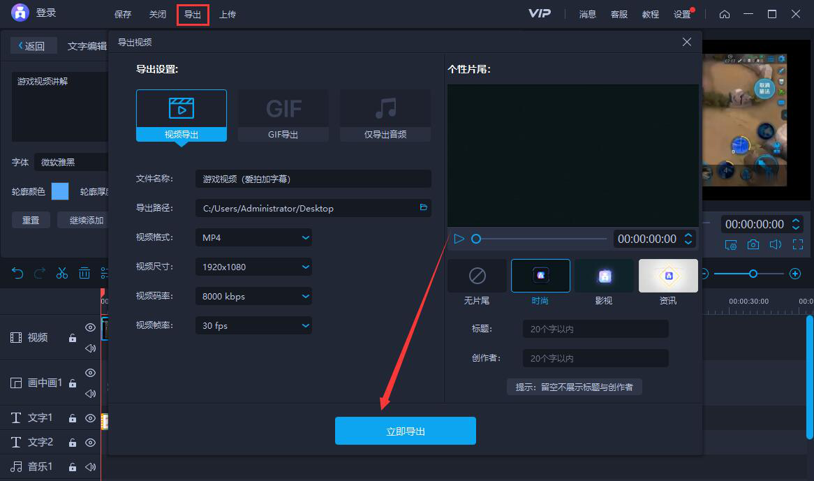 9、生成素材完成后,就点击爱拍菜单栏中的“导出”,并在它弹出的导出设置窗口中,根据自己的需要设置添加了字幕后的视频的文件名称、保存路径、格式等等,设置完了,点击“立即导出”按钮。