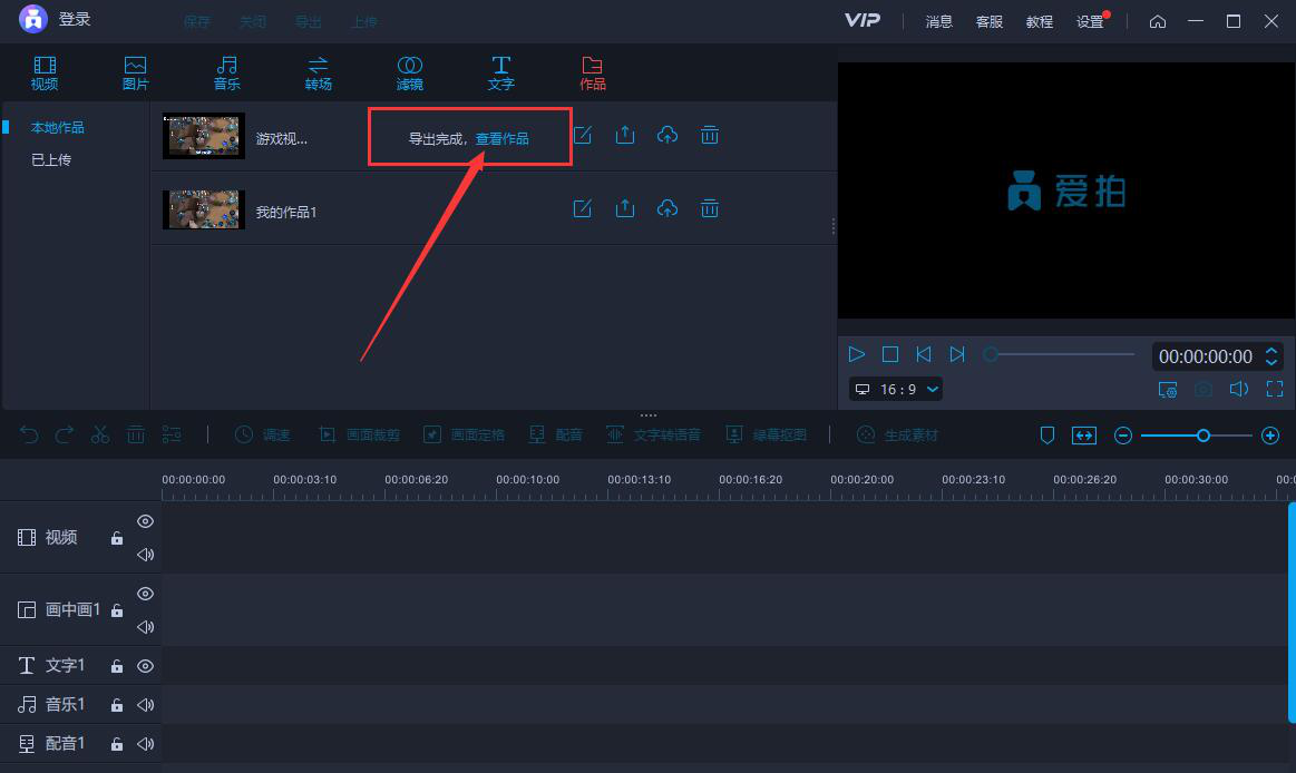 10、最后,当界面中显示“导出完成”,那就说明爱拍将添加了字幕后的视频给保存下来了,点击“查看作品”,即可快速打开处理后的视频了。