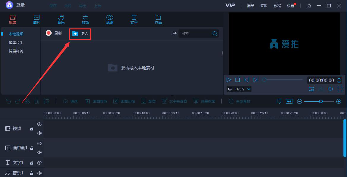 2、进入爱拍的视频编辑界面,我们点击“导入”按钮。