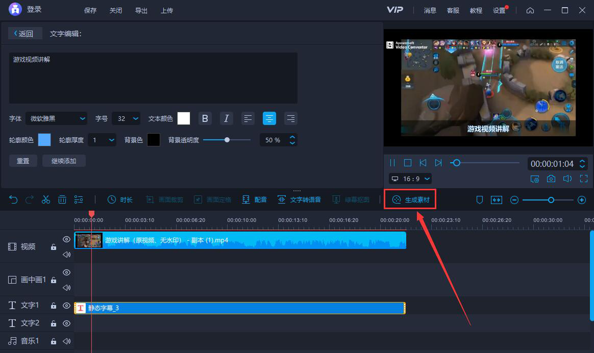 8、接着,我们可以点击视频预览窗口下方的播放按钮,看给视频添加了字幕后的效果。若无需再修改,就点击爱拍中的“生成素材”按钮。
