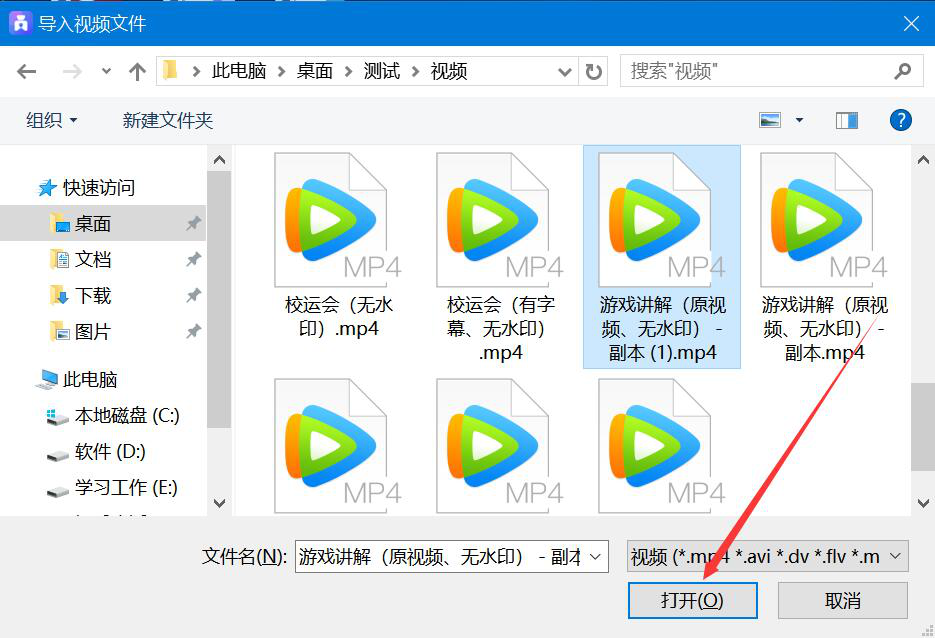 3、然后,在弹出的窗口中,将需要添加字幕的视频文件选中,并点击“打开”按钮,将它导入爱拍。