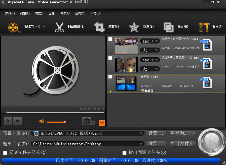 8、最后,当界面显示总进度100%的时候,说明Bigasoft Total Video Converter已经将合并好的视频保存到指定的路径了。