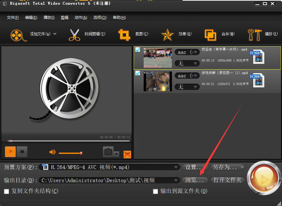 3、然后,在Bigasoft Total Video Converter操作界面中,如果视频合并后输出的目录需要更改的话,就点击“浏览”按钮。