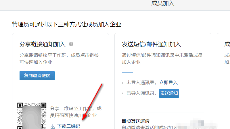 打开管理工具,点击【成员加入】,现在你可以下载二维码,通过二维码邀请成员加入企业微信。