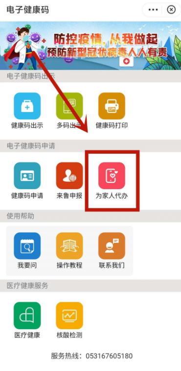 跳转至以下界面,如图,点击【电子健康码申请】——【为家人代办】选项,