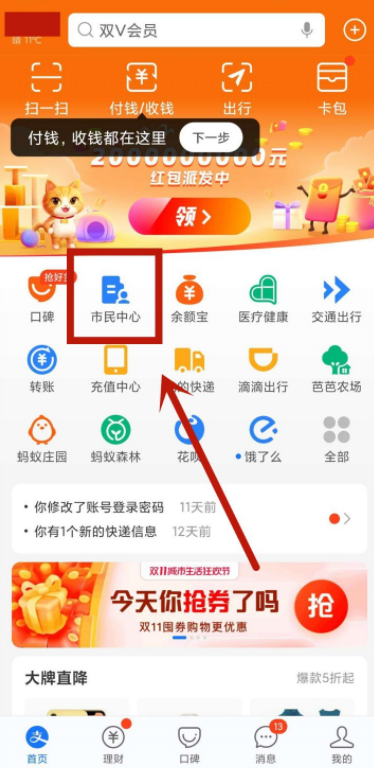 打开手机支付宝,进入首页,点击【市民中心】,如果没找到,可以在上方搜索栏进行查找,