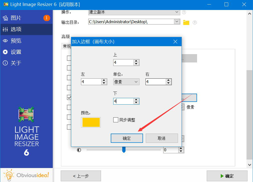 6、此时,Light Image Resizer会弹出加入边框的设置窗口。我们设置边框的上、下、左、右的像素,也可以点击颜色,选择自己喜欢的颜色,再点击“确定”按钮。