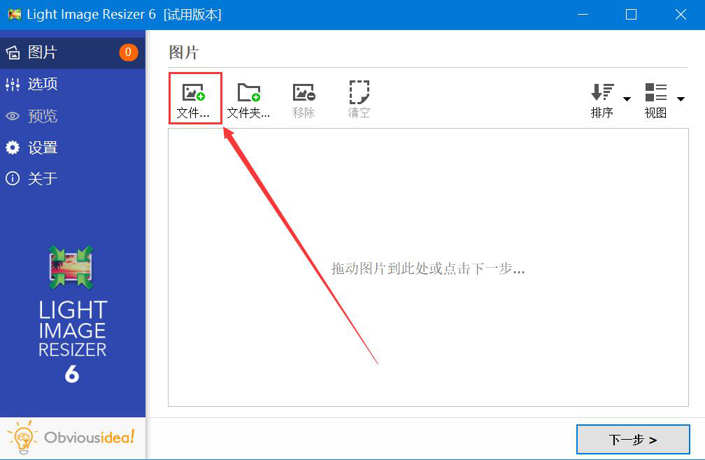 1、首先,我们打开Light Image Resizer。先在左侧的功能栏中切换至“图片”操作界面,并在右侧界面中点击“文件”添加按钮。