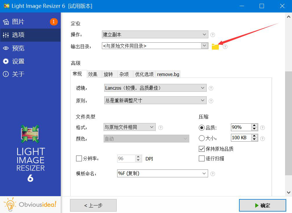 3、然后,在Light Image Resizer中,我们切换至“选项”操作界面。如果图片添加了边框后的输出目录要更改,就点击如下图的文件夹按钮。
