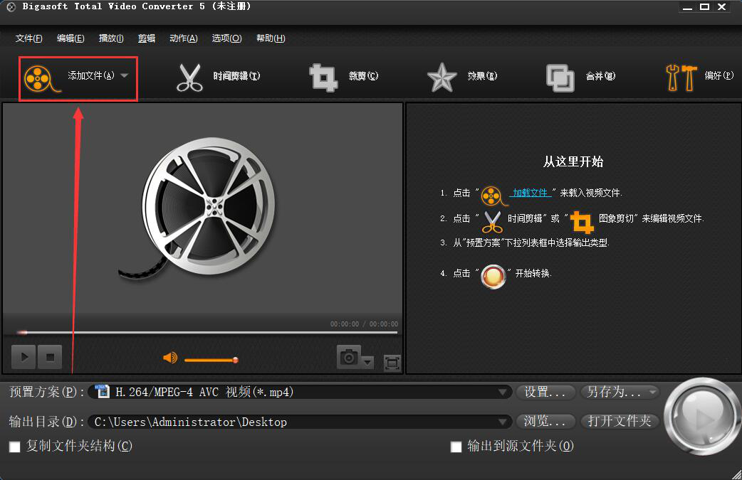 1、首先,进入Bigasoft Total Video Converter的操作界面,点击左上方的“添加文件”按钮。