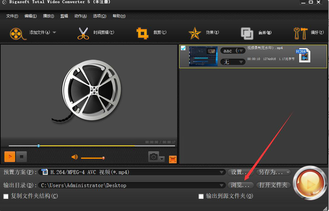 6、接下来,回到Bigasoft Total Video Converter操作界面,如果裁剪后的视频的输出目录需要更改,就点击“浏览”按钮。
