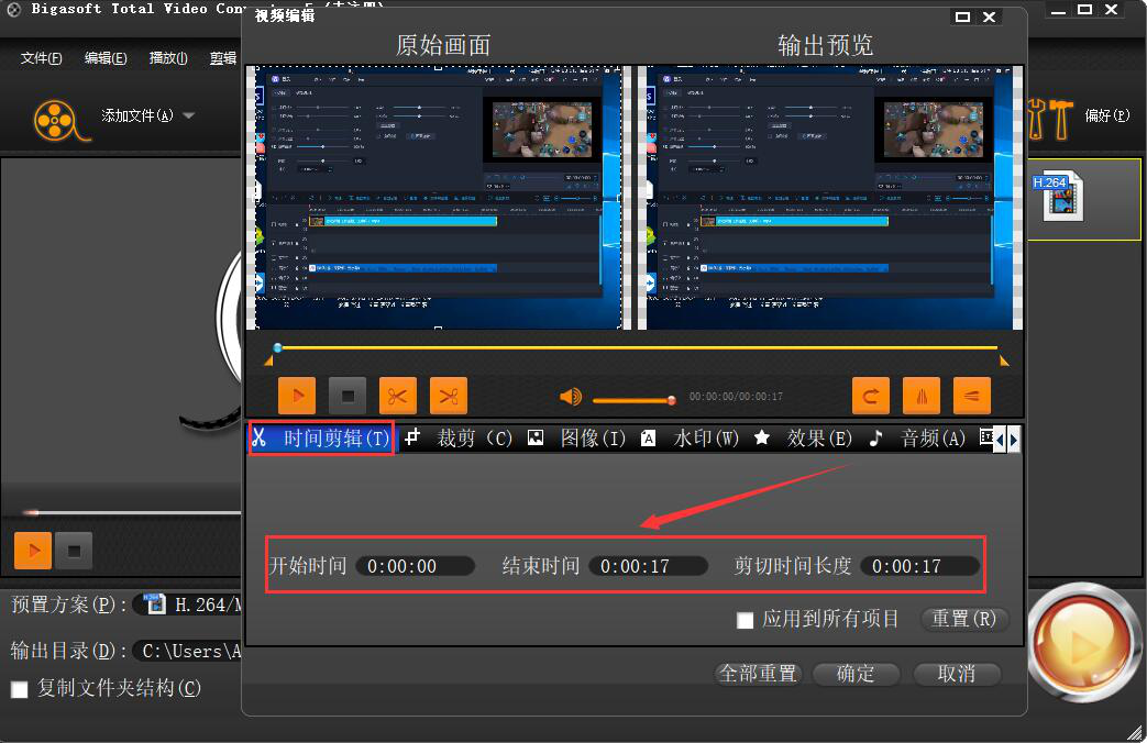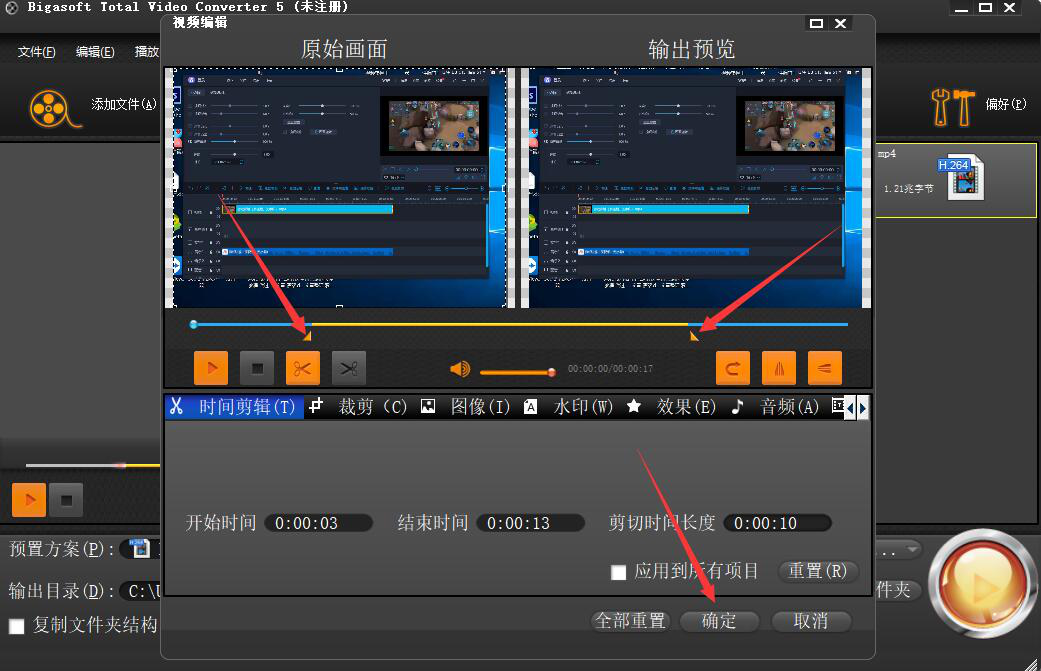 4、此时,Bigasoft Total Video Converter会弹出视频剪辑窗口。我们可以直接根据自己要裁剪的视频片段设置开始时间和结束时间,如下图。