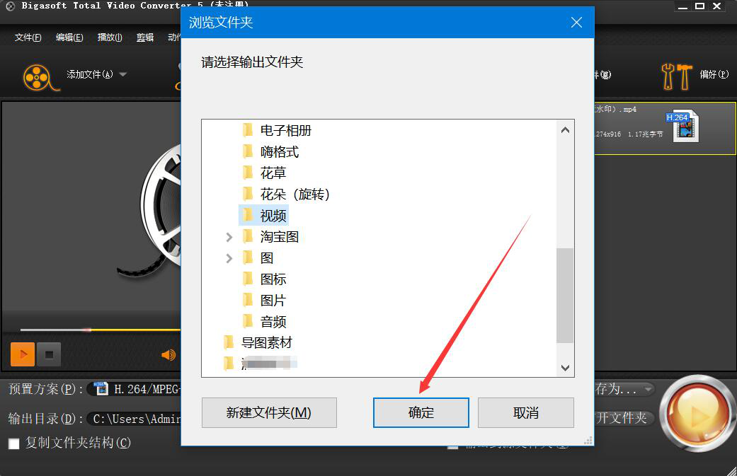 7、在弹出的窗口中,选择用Bigasoft Total Video Converter裁剪的视频的保存路径,并点击“确定”按钮。