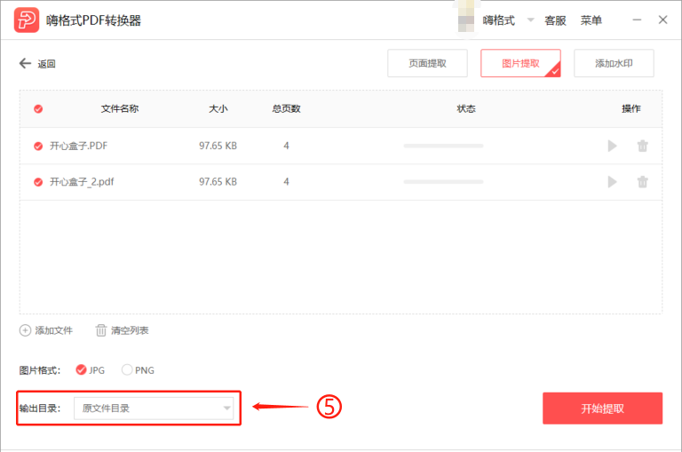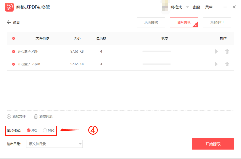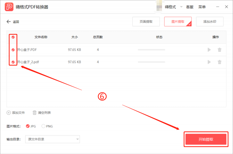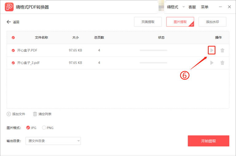 点击开始图标,逐个提取文件图片,或者勾选所有的文件,点击【开始提取】,即可批量提取文件图片。