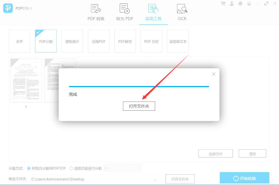 7、最后,当弹出如下图的窗口提示时,说明PDF转换王完成了PDF文件的分割和保存,点击“打开文件夹”按钮,即可快速打开分割后的PDF文件。