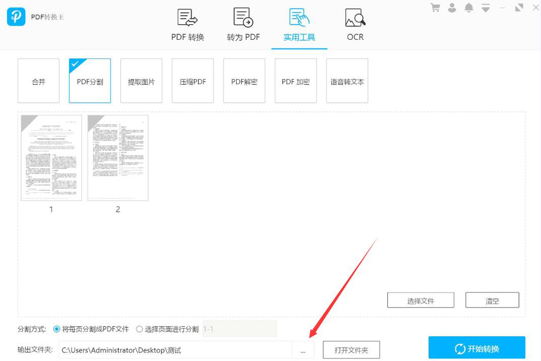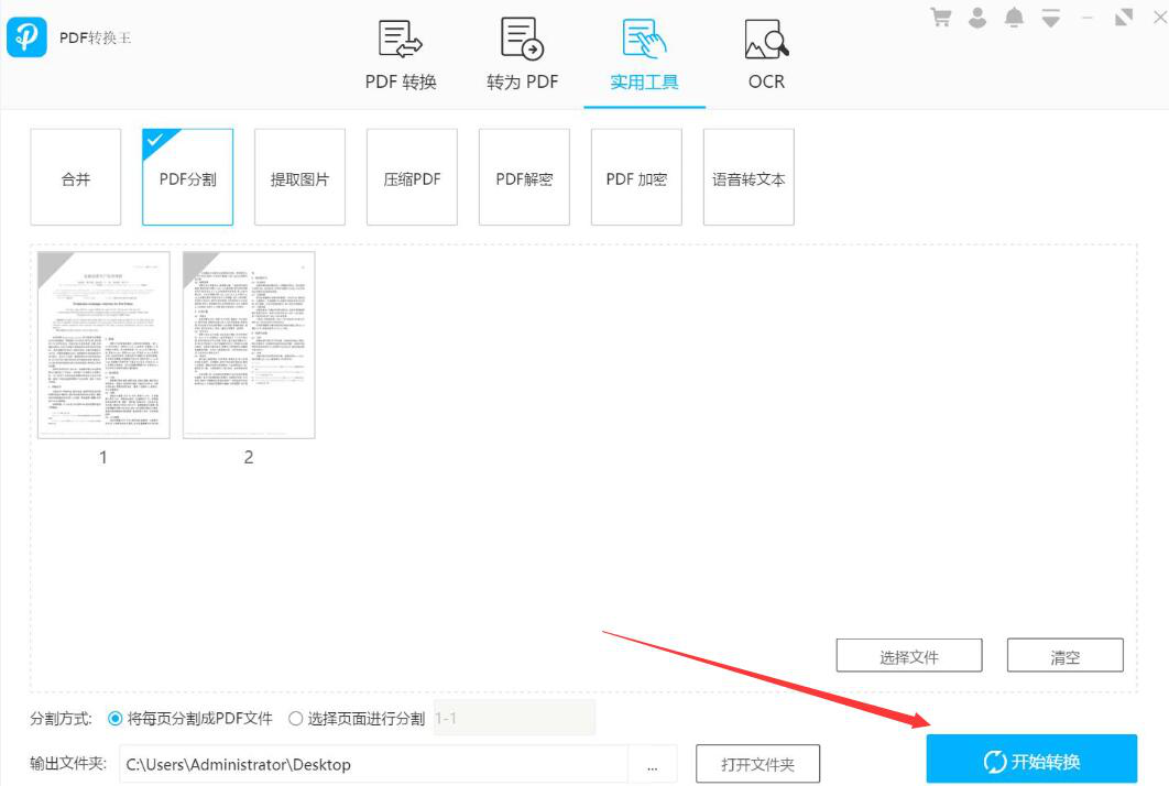 6、PDF文件分割的方式和输出路径设置好了后,点击界面右下方的“开始转换”按钮,PDF转换王便开始执行分割PDF文件的命令。