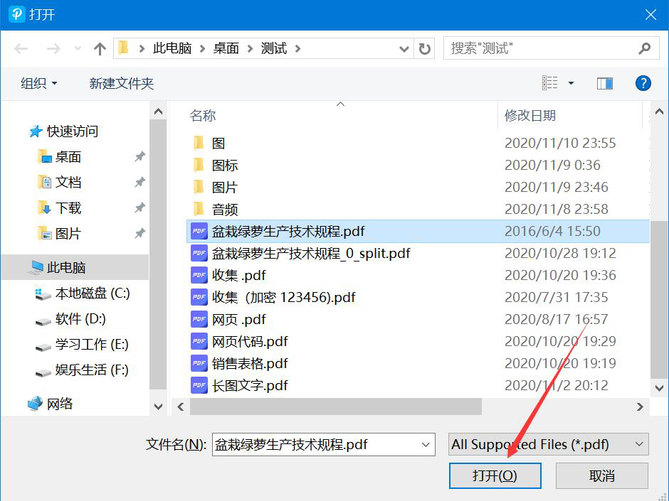 2、在弹出的窗口中,将需要分割的PDF文件选中,并点击“打开”按钮,将它导入PDF转换王。