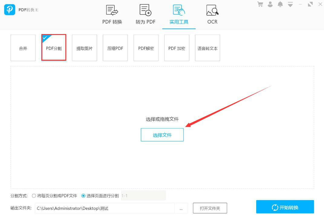 1、首先,我们打开PDF转换王,切换至“实用工具”操作界面,选择“PDF分割”,并点击界面中部的“选择文件”按钮。