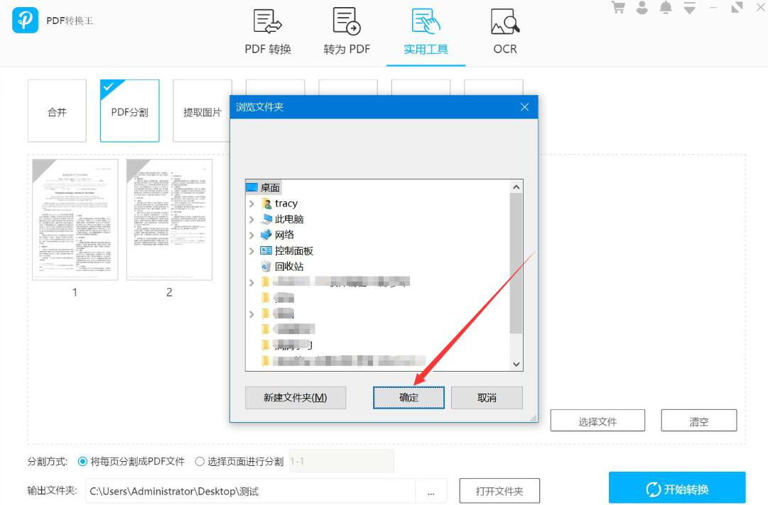 5、此时,PDF转换王便会弹出浏览文件夹窗口,我们选择PDF文件分割后的保存路径,再点击“确定”按钮。