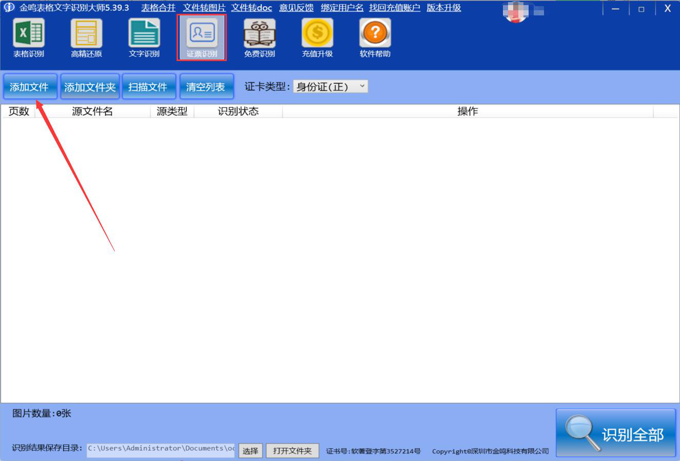 1、首先,我们打开金鸣文表识别系统。切换至“证票识别”的功能界面,并点击界面左上方的“添加文件”按钮。