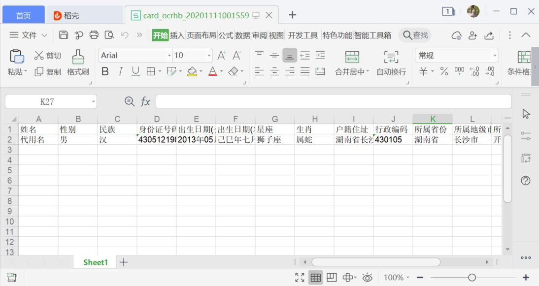 9、最后,可以在Excel表格中看到金鸣文表识别系统将身份证信息识别出来的结果,每一项内容都识别正确。