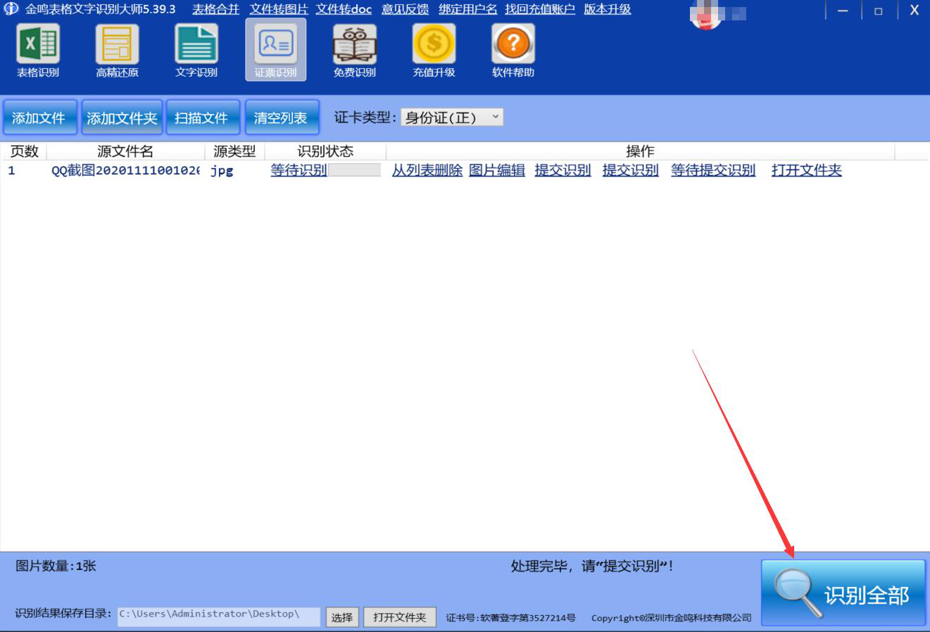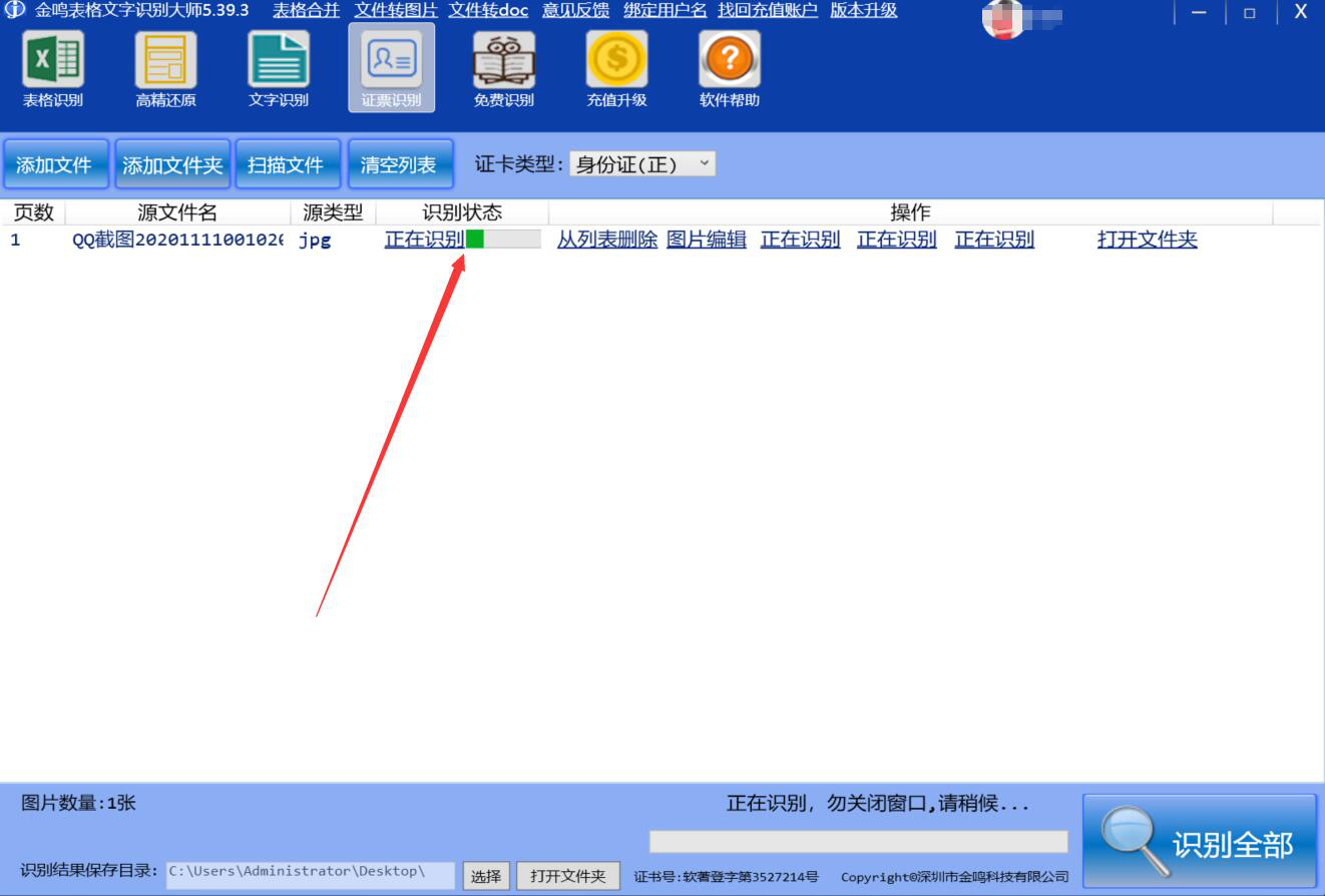6、接下来,我们点击界面右下方的“识别全部”按钮,金鸣文表识别系统便开始识别身份证信息。