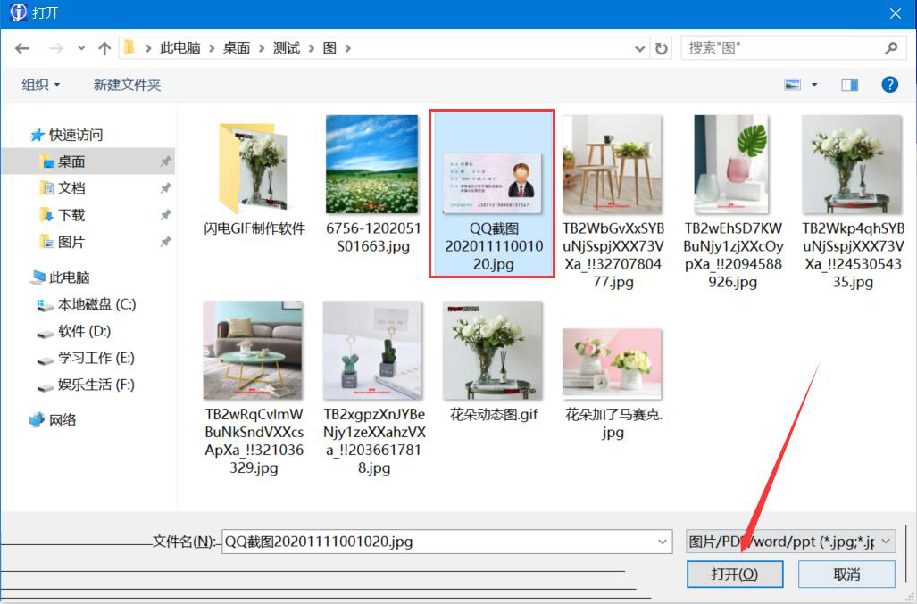 2、在弹出的窗口中,将需要识别身份证信息的照片选中,并点击“打开”按钮,将其导入金鸣文表识别系统。