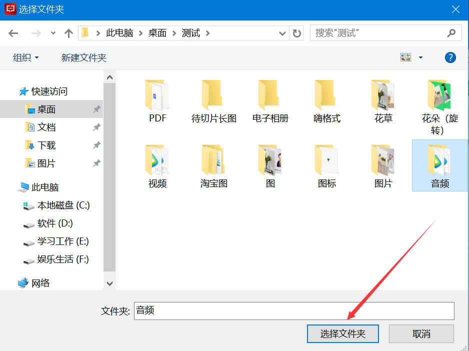 7、接下来,在弹出的窗口中,选择文字转语音的输出路径,再点击“选择文件夹”按钮。