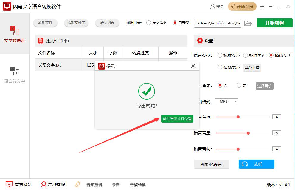 9、最后,如果弹出如下图的窗口提示,就说明闪电文字语音转换软件成功地将文字转语音了,并且还将语音文件保存到指定的路径中了。我们点击“前往导出文件位置”按钮即可快速查看。