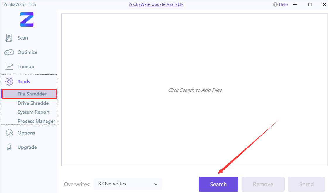 2、此时,ZookaWare便会展开“Tools”菜单中的所有选项。我们从中点击“File Shredder”文件粉碎选项,并点击右侧界面中的“Search”按钮。