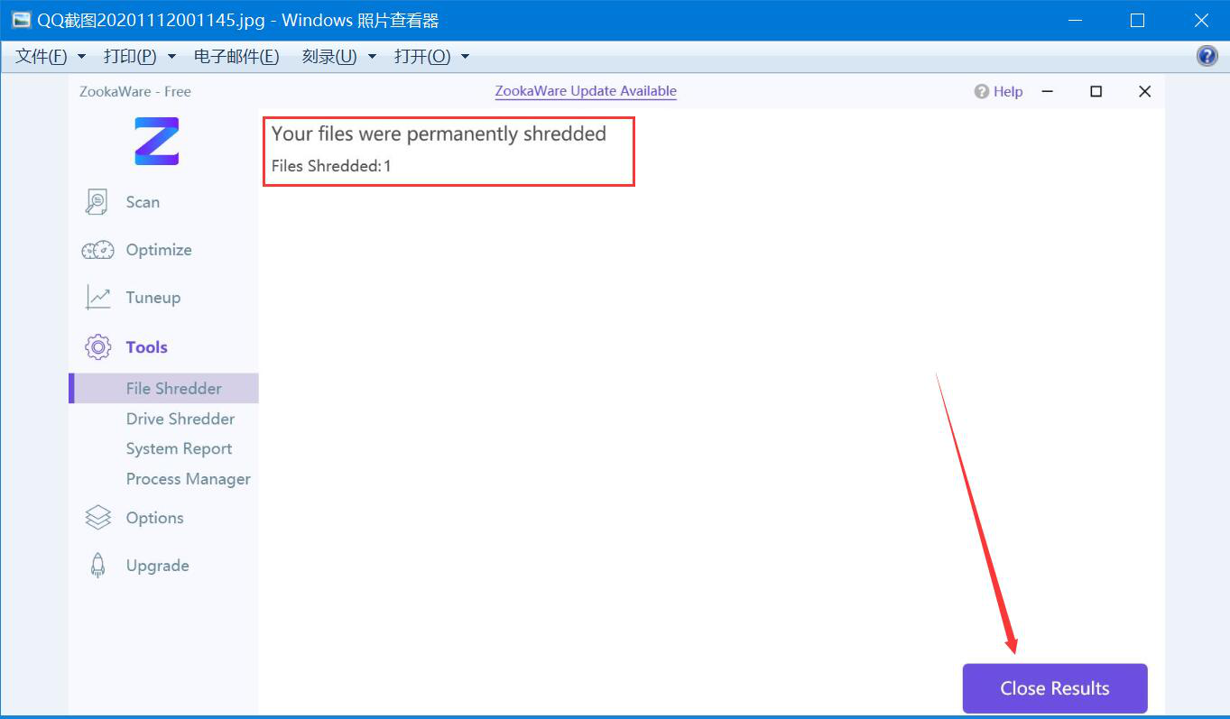 6、最后,如果界面中显示电脑文件粉碎完成,ZookaWare会显示已经粉碎的文件数量,我们直接点击右下方的“Close Results”按钮即可。