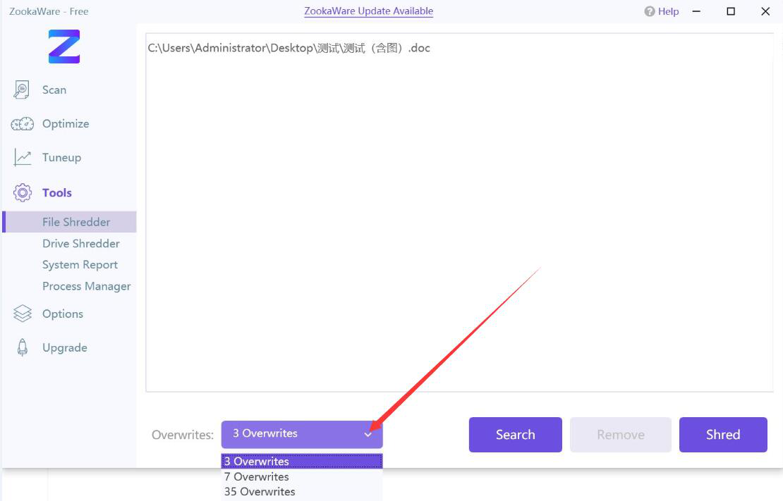 4、回到ZookaWare操作界面,点击“Overwrites”处的倒三角图标按钮,并根据自己的需要选择电脑文件粉碎的方式,这里选择的是它默认的“3 Overwrites”方式。
